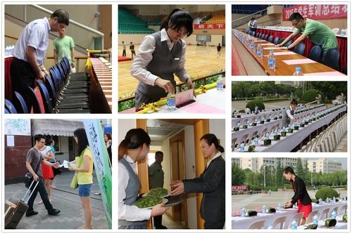 乐乎楼集团在行政楼设立有办公点(以下简称行政楼),本次军训行政楼负责三项事务:入营式、阅兵式和开学典礼开始前的准备工作。准备工作繁杂琐碎,光铺台布就有不同规格,入营式台布长度要分2排,而阅兵式和开学典礼又是分3排。8月26日当天,行政楼团队早上6:45就到达了阅兵式的场地,根据会务要求,台布要求铺设的干净整齐,席卡、毛巾、矿水、资料要求成一直线,为此还特别拉了一根线来逐一检验。虽然时间紧、任务重,但会务团队严格按照会务要求,规范操作,一丝不苟,最后出来的效果就和解放军站军姿一样,几乎分毫不差。随后未等阅兵式开始,他们又马不停蹄的赶到体育馆准备开学典礼的事宜。他们都是默默无闻的“上大人”之一,正是有了无数像他们这样的“上大人”才使得上大军训期间三大仪式的顺利召开得到保证。