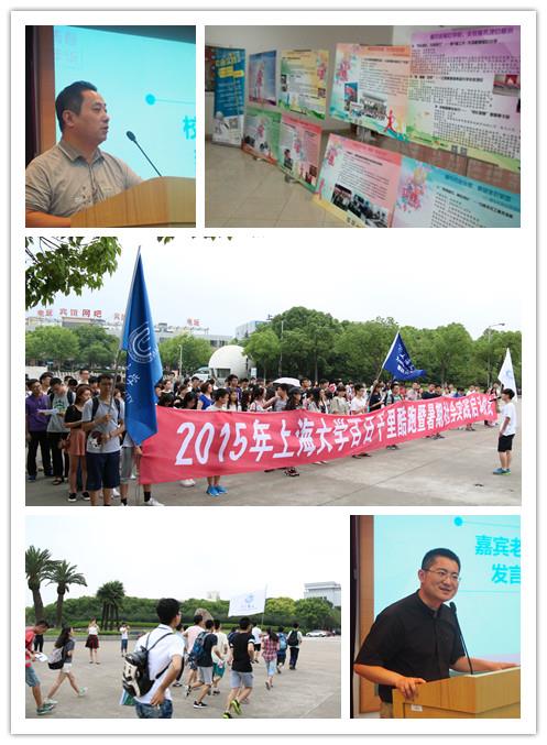 6月23日,2015年德赢ac米兰官方合作vwin百日千里酷跑暨暑期社会实践启动仪式在宝山校区举行。校党委宣传部部长李坚、校团委书记、学工办副主任许烁、《瞭望东方周刊》主任编辑黄琳、校招毕办王平老师以及各学院的团学干部、社会实践团成员近200人参加了此次活动。