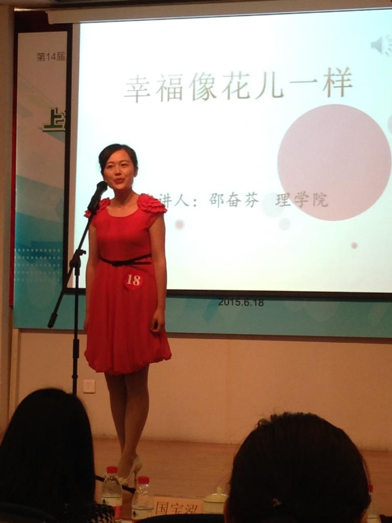 6月18日下午,在新校区行政楼报告厅,理学院邵奋芬老师获得德赢ac米兰官方合作vwin2015年“寻找校园里的幸福”教职工演讲赛一等奖。