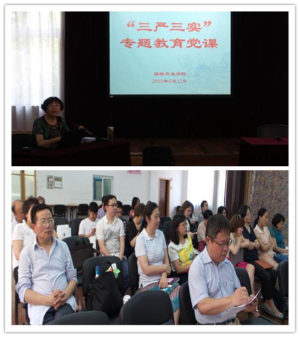 接着,王海燕老师结合国家、上海市、学校的发展规划和学院的发展愿景,分析了学院发展所面临的机遇和瓶颈问题。她直言不讳地指出:我院在领导管理服务、学科建设和队伍建设方面,不同程度地存在着“疏于学习、宗旨意识淡化”、“动力不足、冲劲不足”、“安于现状、小进则满”、“等、推、拖、要”的问题。她在党课上提出:命运共同体是国际交流学院的生存发展之路,即学院的生存和发展与国际大环境、国家上海学校的发展息息相关,是一个大的命运共同体;我们个人的成长与学院的发展密不可分,是一个小的命运共同体。因此,我们要把“三严三实”的学习教育实践渗透到日常工作的每个活动之中,融入到学院工作的全过程之中,坚持群众路线、化内耗为合力、团结就是力量,全院上下一起努力,加强教师队伍和干部队伍建设,加强领导干部和党员的作风建设,将“三严三实”教育内化于心、外化于行,以行动破解“六易六不易”困局,通过汉语桥、乘着世界、在实现中国梦的过程中做出国交人应有的担当,实现个人成长与学院发展的双赢。