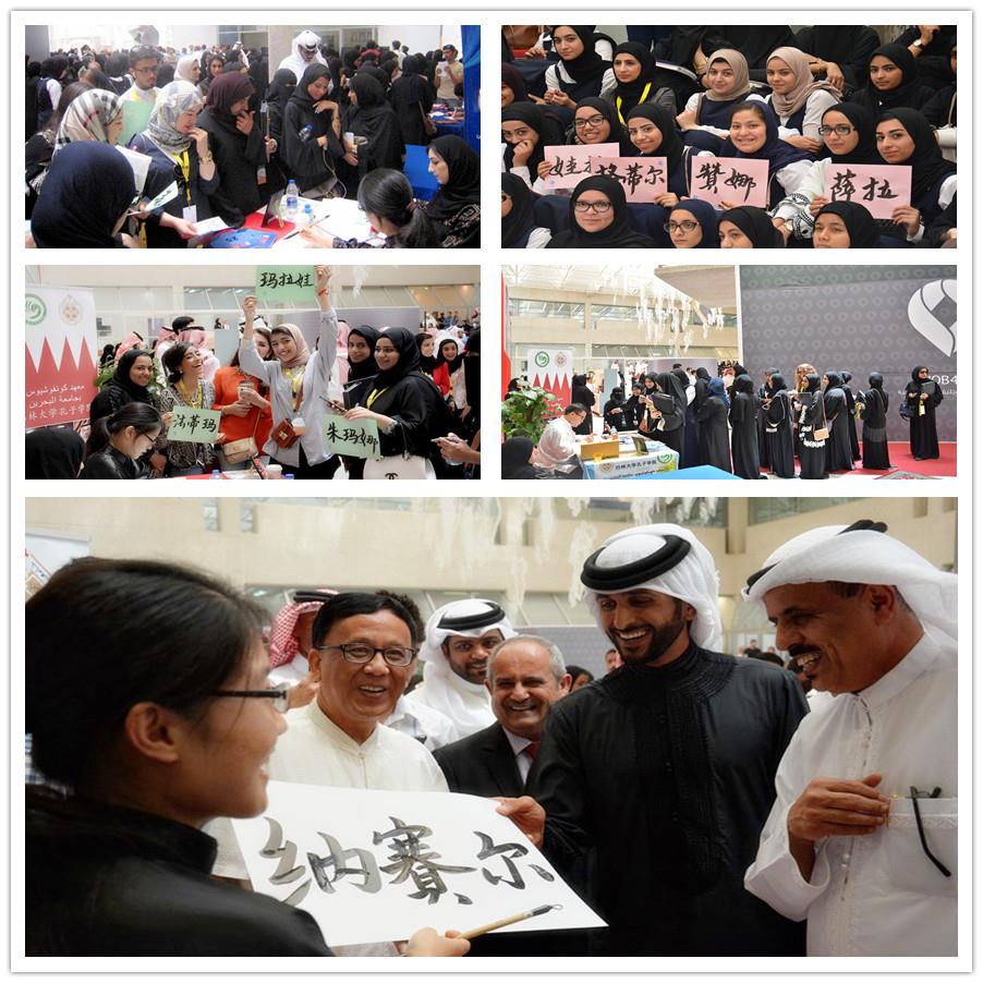 家有宝树,有凤来仪——30日,巴林王国青年与奥林匹克委员会主席,巴林王国王子殿下纳赛尔·本·哈马德在巴林王国教育大臣马吉德先生和巴林大学校长贾纳哈博士的陪同下到会参加闭幕式,并专门来到巴林大学孔子学院展区问候孔院院长和老师们。中方院长汪剑康向王子介绍巴林大学孔子学院的情况,志愿者老师王美璐现场为王子殿下书写汉语名字。当王子殿下看到自己的中文名字时,高兴地的说:“我非常喜欢这个中国礼物,希望巴林大学孔子学院能办成海湾地区的典范。”