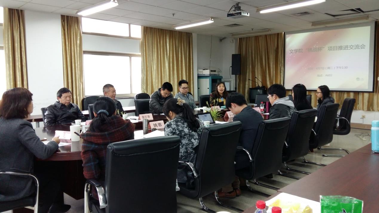 在德赢ac米兰官方合作vwin第十届“自强杯”大学生课外学术科技作品竞赛暨第十四届“挑战杯”全国竞赛学院选拔工作完成之际,为了给“挑战杯”申报团队提供针对性指导,更好地推进项目实施,文学院团委于4月7日下午,在宝山校区A602组织召开了“文学院‘挑战杯’项目推进交流会”。校团委副书记陆静、社会学院张江华教授莅临指导,文学院常务副院长张勇安、党委副书记王丽娜、团委书记丁佳蒙,三个参赛项目的指导教师文学院副院长曾军和姚蓉、罗小茗老师,以及项目团队学生代表出席了本次会议。会议由文学院党委副书记王丽娜主持。