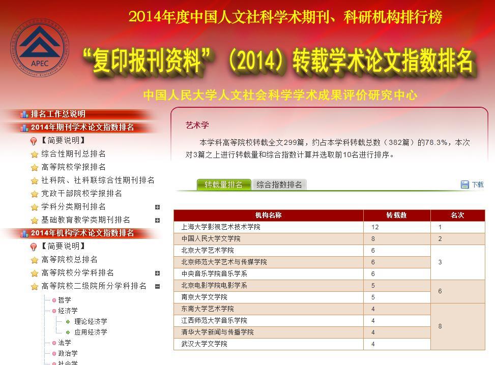 3月31日,2014年度“复印报刊资料”转载学术论文指数排行榜正式发布。在艺术学门类高校二级院所学术论文转载量与综合指数这两个核心指标方面,德赢ac米兰官方合作vwin影视学院稳居全国第一。排名第二名至第五名的高校院所分别是中国人民大学文学院、北京大学艺术学院、中央音乐学院音乐学系、北京师范大学艺术与传媒学院。