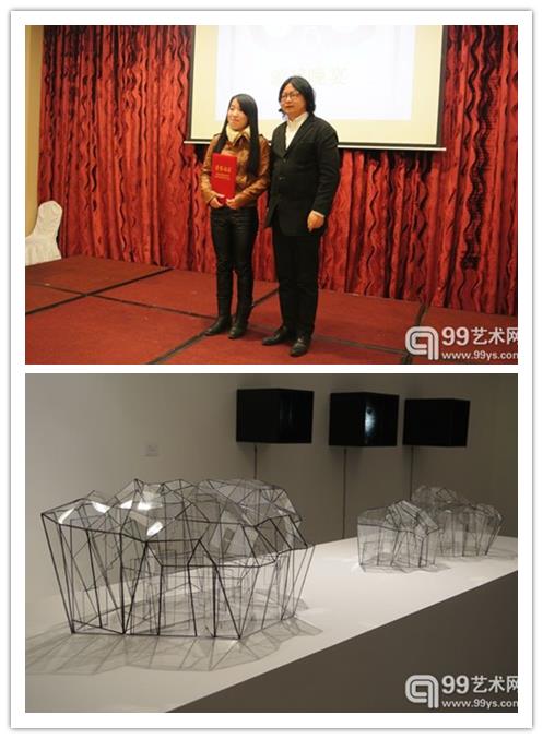 陈倩的金奖作品《关》,是用透明的材料搭建了一个复杂互相穿越的空间,这个空间如同晶体一般,各种空间以各自不同贴着的方式互相拼贴,互相绞缠。边缘形成一种秩序化了的线条,在各个空间纵横交错,来回穿梭跳跃,使空间成为一种可以看穿本质的游戏。陈倩使一个三维空间在不同方向上成为了一个二维的平面图画的排列矩阵。