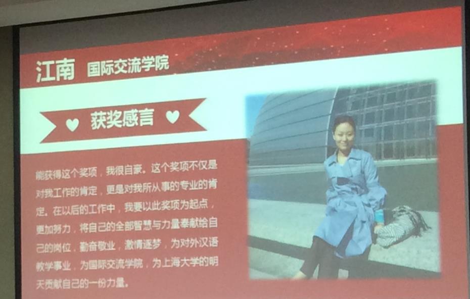 自2011年进入我院工作以来,江南主动承担了繁重的教学任务,以学生为主体进行教学,取得了良好的教学效果;并于2013年6月获得了德赢官网“汉语国际教育”专业硕士生导师资格。在繁重的教学任务之余,江南老师仍不忘坚持关注学科的前沿理论和最新科研成果,阅读专业书籍和期刊文章,力争将教学与科研相结合。工作三年多来,她取得了良好的科研成果,主持和参与各类科研项目5项、发表论文2篇、参编教材2部、参与撰写文集1部、参加学术会议并宣读论文2次。2014年6月,她主持的课题《赵元任汉语作为外语教学学术思想研究》获国家社科基金青年项目立项。江南老师此次荣获蔡冠深优秀青年教师奖,为学院赢得了荣誉,鼓舞了士气,表明我院教师在繁重的教学任务下仍然能够做科研,并且能够做好科研。