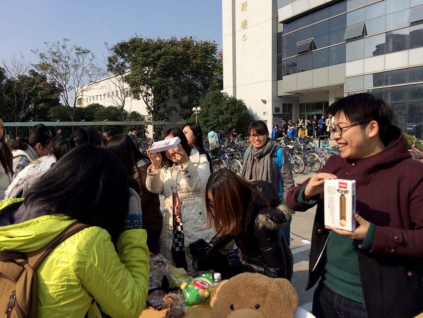 活动前一周我支部在上大信使、上大司令等平台对本活动进行宣传,校园里回荡着即将义卖的通告,党员和积极分子通过扫楼等方式加强预热,12月8日在益新食堂门口的义卖正式拉开帷幕,义卖现场十分火爆,主持人社的宋志超和刘玉莹高举广告牌在路口叫卖,提前录制的高大上中英双语音频更是吸引了人流,义卖的品种也很丰富精彩,各种波西米亚风、吉普赛风的首饰,化妆品,香水,台灯,小电扇,“鸟叔熊”等种类繁多的义卖物品纷纷引得路人上前挑选;此次义卖物品,大多是八九成新,还有很多全新的物品被募捐出来。广告系辅导员朱亦春老师也捐出了Teenine weenie的包包以及裙子、香水等物品,我们还在义卖物品中发现了卡西欧的计算器、lomo相机、实用的电卷棒、打蛋器等,义卖物品的质量可以说是相当之高。现场竞拍热心同学募捐的全新iPod Shuffle将整个活动推向高潮。原定两天的义卖一天就完美收官了,据义卖结束后的账目实时清点,当天总共卖出2201.4元。虽然党员和积极分子们在寒风凌冽中站得脚酸了,喊得嗓子哑了,但充满爱心的心情却是甜蜜的。