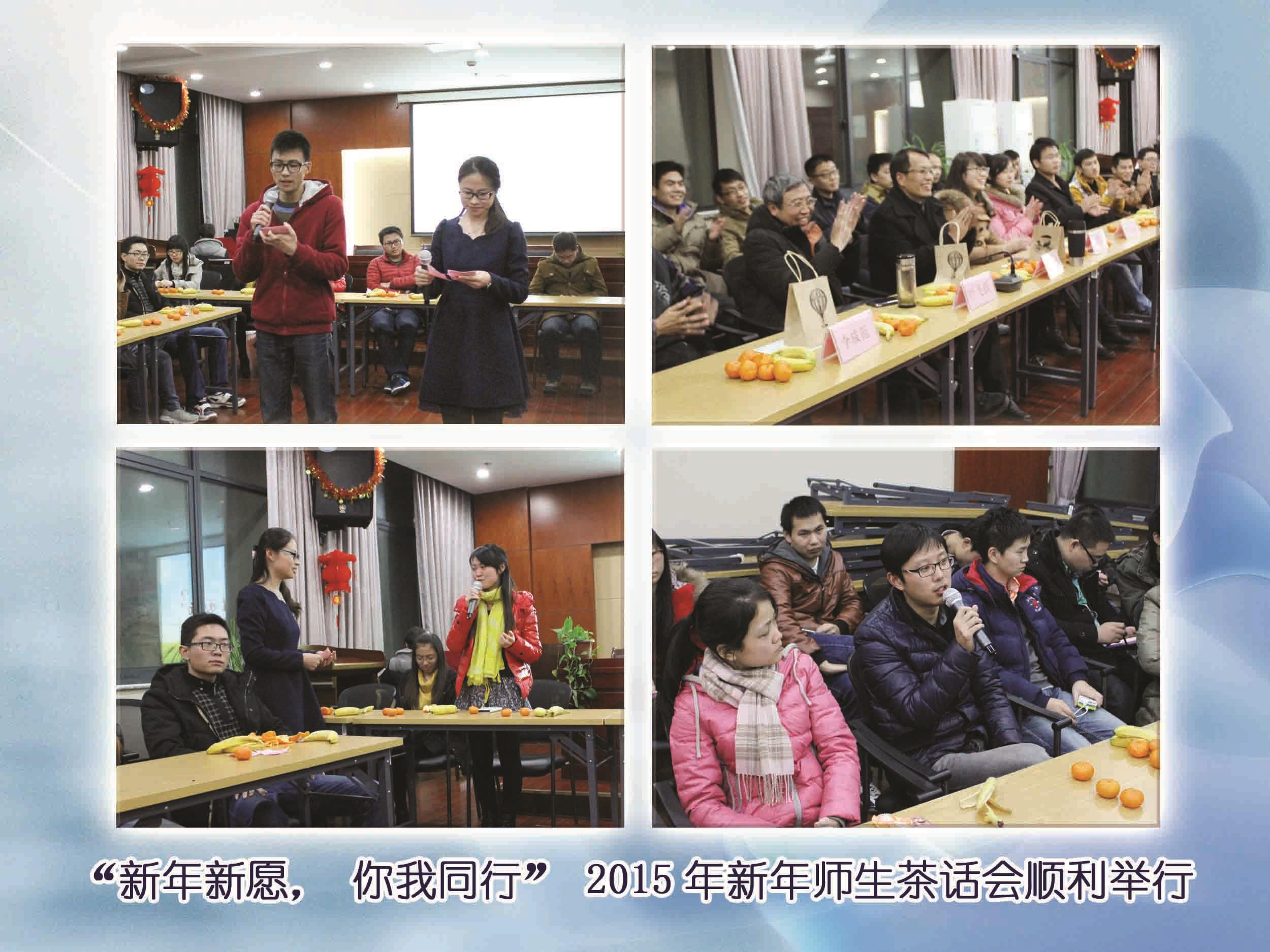 “新年新愿,你我同行”,在新的一年到来之际,为了让同学们更好的融入研究生生活,并解答大家在学习和生活中的疑惑,计算机工程与科学学院于2014年12月26日18点在计算机大楼1106室召开了“新年新愿,你我同行”师生茶话会。出席本次会议的嘉宾有德赢ac米兰官方合作vwin计算机学院党委书记朱永华老师、副院长叶飞跃老师、副院长吴悦老师、彭俊杰老师、曹旻老师、张惠然老师、李成范老师、研究生专职辅导员夏明帅老师、兼职辅导员许素娟老师和翟思达学姐,研究生一年级的同学也悉数参加了本次茶话会。点燃梦想,努力前行
