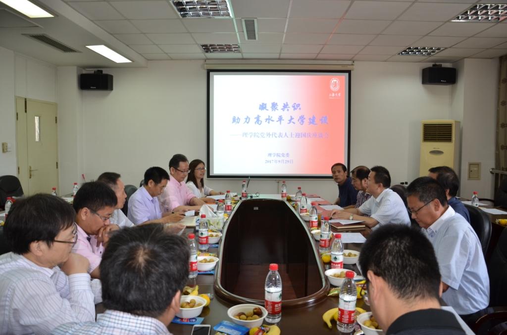 9月29日上午,理学院院系党政班子成员及来自学院各系所民主党派、无党派人士、归侨侨眷、留学归国人员、中青年党外后备人才及专业技术骨干的党外人士代表近40人欢聚一堂,喜迎国庆,共话发展。校统战部部长、组织人事部副部长曹为民,统战部副部长李青应邀出席会议。座谈会由学院党委副书记王东媛主持。