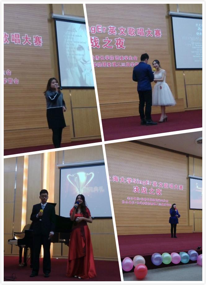本次比赛由德赢ac米兰官方合作vwin钱伟长学院团委学生会E-club特别策划和主办,社区学院理工三组团委学生会协办。大赛分为初赛、复赛和决赛三个比赛阶段,共历时一个月。在历经了层层角逐之后,共有来自钱伟长学院、机自学院、音乐学院、社区学院、材料学院的11位不同学院不同专业年级的同学晋级决赛。“眼神迷离,舞步蹁跹……”一曲《marry you》毕,决赛便在这轻松愉快的节奏中拉开帷幕。在莅临领导的致辞后,决战之声正式唱响。第一轮,选手们共分为五组,每组选手共同演唱一首英文歌曲,进行组合对战。在选手们声情并茂地演唱后,由现场的五位评委进行点评并投票,在每组中产生一名直接晋级的选手。通过这一轮的比拼,各个组合之间,虽是作为比赛对手,但却能够在此过程中互相学习互相进步的情状,这也算是契合了本次大赛的目的之一——促进正值青春、怀揣梦想、热爱歌唱和英文的同学们的交流,效果显著。第一轮的第二部分是待定选手晋级赛,由上一阶段未能直接晋级的六位选手两两抽签组合清唱对战。半分钟的清唱后,由评委选出两位中的一位进入下一轮比拼。脱离复杂的音响伴奏后,选手们以极好的嗓音条件呈现出一首首悦耳的经典英文曲目,令人心醉。在经过艰难而公正的抉择后,评委们投票选出了三位选手晋级。比赛要求突出个人特性,Sing-E-r的舞台就给同学们提供了一个展示自我风采的良好平台——第二轮便是“诸神之战”的独唱比拼。第一轮晋级的八位实力唱将依次演唱自己精心准备的英文曲目,并由各评委打分。各位选手风格迥异,他们的歌声或婉转动听,珠圆玉润,或富有激情,铿锵有力,每个人都大放异彩。最后,三位女生天籁般的嗓音折服了评委,脱颖而出,进入了最后的征战。大赛进入最令人兴奋的高潮与结尾——第三轮的冠军争夺战。每首歌的背后都有一段故事,每一段故事都有其生命中一个重要的人。第三轮的比赛,三位选手为他们生命中一个重要的人献歌,歌声动听,感情真挚,赢得了现场听众们一阵阵的热烈掌声。经过紧张的结果统计后,大赛评出了“最具气质奖”、“最具潜力奖”、“最佳台风奖”三个特别奖;最终,来自音乐学院的尹梦瑶荣获季军,来自钱伟长学院的饶津渝荣获亚军,而来自社区学院的徐恭瑜荣登顶峰,成为第一届Sing-E-r的冠军。