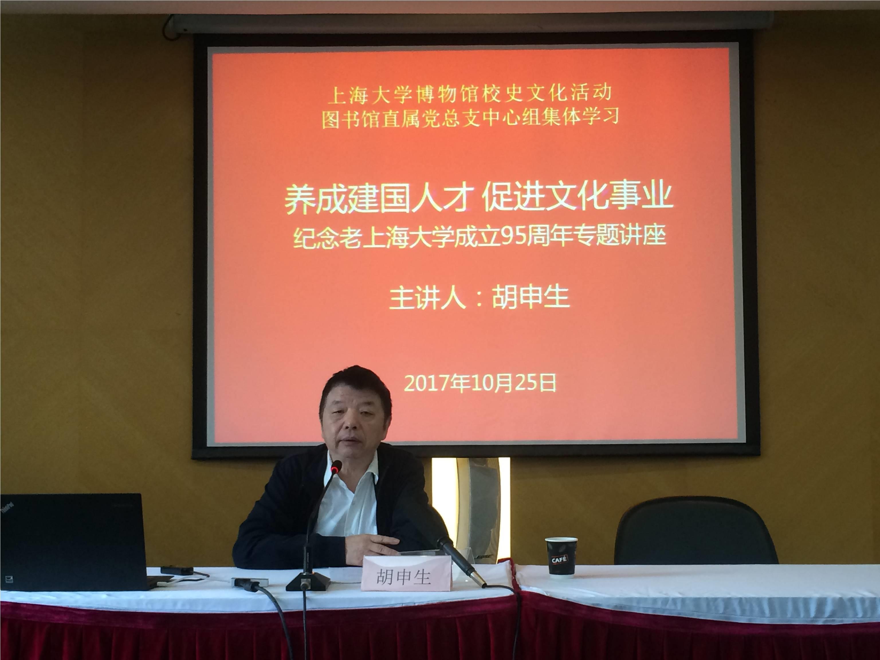 10月25日,图书馆党总支根据学校“两学一做”提示(13)的精神,在图书馆国源厅举行中心组集体学习,博物馆党支部承办并邀请人才学院胡申生教授,做了题为《养成建国人才 促进文化事业》的讲座,博物馆馆长刘绍学主持此次讲座。 胡申生教授作为溯园建设的文字组组长,结合“十九大”精神,热情洋溢地介绍了老德赢ac米兰官方合作vwin的办学经历、重要社会影响和著名校友的轶事,并勉励上大师生不忘初心,传承老上大办学理念,不断前行,弘扬老上大精神。
