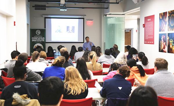 美国东部时间11月7日下午五时,上海外国语大学史志康教授一行应邀访问肯塔基大学孔子学院,在全球示范孔院新大楼多功能厅做了题为《东西方文化价值意蕴相似性》的英文讲座。孔院院长修华静博士首先向来宾介绍了孔院向全校师生和社区民众开放的课程和文化项目与时间安排,之后肯塔基大学新闻与传播学院教授邰子学介绍了史志康教授的学术背景和研究成果。来自孔院本部全体教师、肯大新闻传播学院、文理学院的师生近60人聆听了讲座。报告会由修华静院长主持。