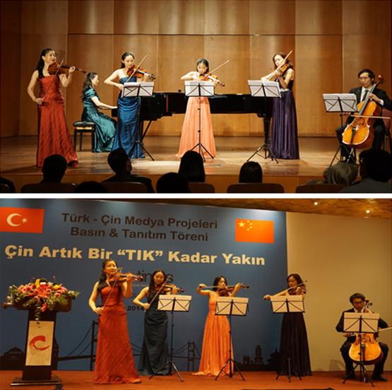 2014年10月23日,著名小提琴家夏小曹携德赢ac米兰官方合作vwin音乐学院师生在土耳其海峡大学举办音乐会,庆祝该校孔子学院成立五周年。在音乐会前,中方院长刘义博士简单介绍了海峡大学孔子学院的发展,感谢前任的中、外方院长和员工为孔子学院所做的贡献。刘博士特别强调语言是一种声音的理念,而音乐则是一种优美的声音,且比语言文字更具穿透国家和文化界限的力量。音乐会以巴赫的《勃兰登堡协奏曲第三号》开场;夏小曹女士奉献了《沉思》和《查尔达斯》的独奏;并与团队共同演绎了《我的祖国》等曲子。除古典音乐外,新疆民歌《送我一支玫瑰花》、陕北民歌《山丹丹花开红艳艳》等给听众留下了深刻的印象。音乐会后,夏小曹女士还跟海峡的土耳其师生一起跳舞,庆祝此次活动的成功举办。在伊斯坦布尔期间,夏小曹女士还携德赢ac米兰官方合作vwin音乐学院的师生一起访问了伊斯坦布尔科技大学音乐学院、和平音乐学校,一家旨在普及音乐教育的基金会;并在土耳其中国电视频道的开幕式上演奏了两首曲子。