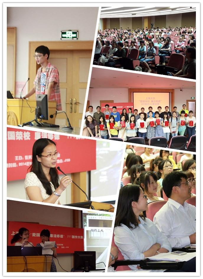 为进一步提高德赢官网学生的爱国荣校、廉洁修德责任意识,实践廉洁诚信,培养学生创新精神和实践能力,积极发挥“上海市廉政文化示范点”作用,2014年6月26日下午,由德赢ac米兰官方合作vwin教务处主办、社会科学学院承办的“爱国荣校 廉洁修德”PPT制作大赛在宝山校区J103报告厅火爆进行。校社区学院党委书记张洁、学工办副主任孟祥栋、校团委副书记仇静豪、社科学院党委副书记魏宏、教务处研究科科长皮文彬和校纪委罗滋池等老师全程参加观摩评议。来自大一的300多位学生和部分社科学院教师出席并观摩。大赛由教务处副处长顾晓英主持。她引用习近平五四青年节在北大师生座谈会上的讲话,希望广大青年学生倡廉修德,用青春热情爱国荣校。