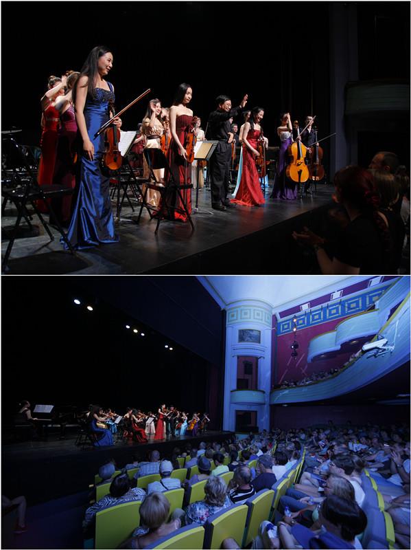 接下来,我们乐团在这座Théâtre Granit先后两天成功举办了两场专场音乐会。由于贝尔福往年从来没有像今年那样炎热,剧院里没有空调系统,弦乐团的同学和老师每演完一首曲子,都汗如雨下。我们的演出就像当地的天气一样,获得了非常热烈的反响。在我们演奏《圣母颂》时,能清晰看见台下有的观众双手交叉于胸前,闭着双眼,虔诚地聆听着,有些甚至还激动地流着眼泪。演罢全场起立鼓掌,掌声经久不衰,我们不得不返场加演。演出结束后,化妆间的门外还有观众等待着我们,问我们有没有CD。他们看到叶校长和夏老师,兴奋地上前握手、说话,虽然都是法语一个字听不懂,但其激动之情溢于言表。