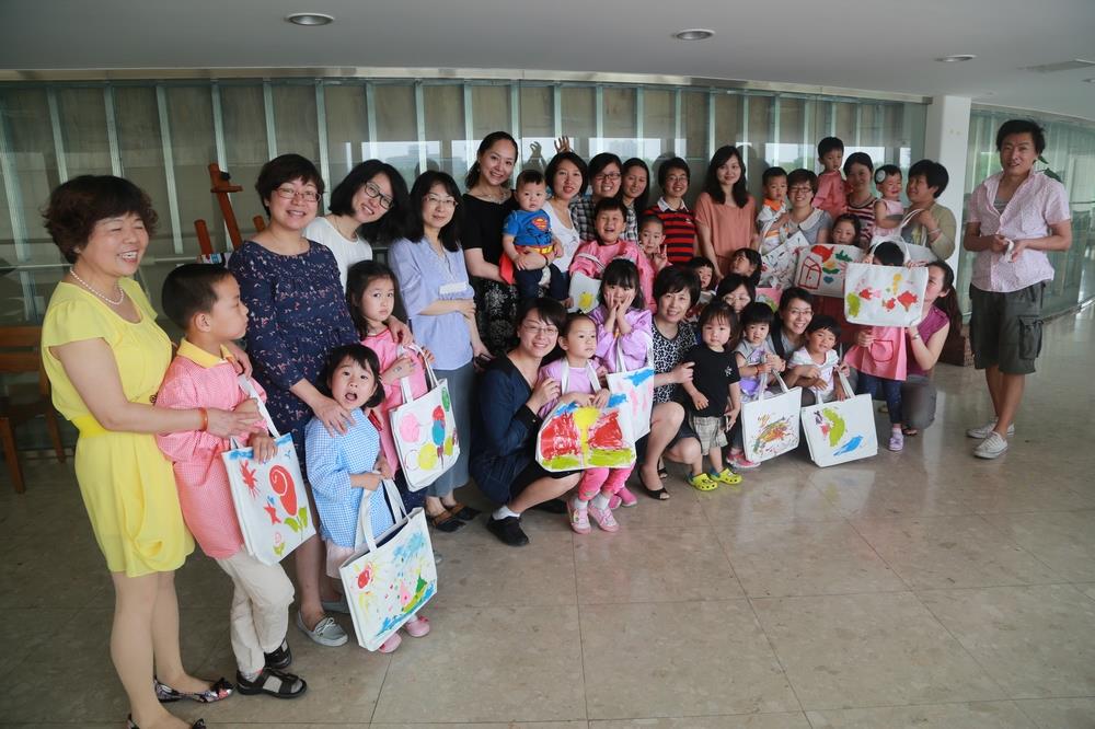6月6日上午九点开始,爸爸妈妈们陆续带着自己的宝宝们来到了美院二楼的教工之家,在工会与妇委会的精心准备下,今年的亲子主题是:神笔宝贝,让宝贝们用自己的创意与激情将一件件普通的环保袋与杯子、盘子渲染上最童真的神彩。活动开始,宝贝们陆续穿上绘画罩衣,开始了自己的神笔“挥毫”,他们自由自信的沾取着盘子中的鲜艳原色,大胆而快乐的释放着童年的梦想,从蓝天到草地、从地球到太空、从公主到王子、从家园到梦境……宝贝们的世界让人纷繁炫目,充满奇趣,爸爸妈妈们或是与宝贝们一起在这个绘画的旅程中交流分享同行,或是在宝贝的身后微笑着看着他们的“宏图巨制”,短短两个小时,宝贝们创作出的作品已经是相当壮观,从印象派到野兽派,从行动派艺术到抽象表现,宝贝们的作品风格真是不拘一格,仿佛经历了一次近当代的艺术表现之旅,让人颇为奇叹。爸爸妈妈们骄傲的拿起宝贝们刚出炉的“热作”,纷纷拍照合影留念。