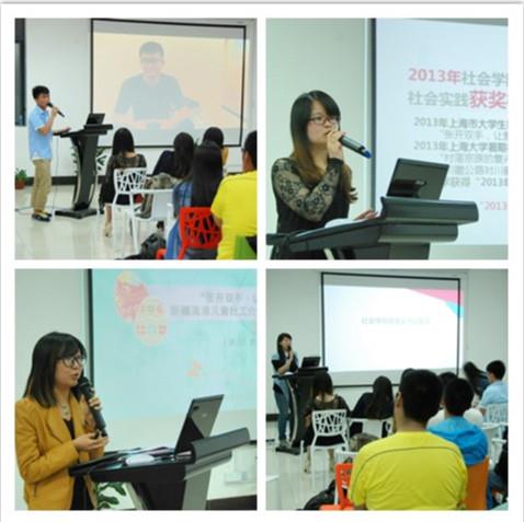 随后进入暑期实践优秀项目分享环节。三位暑期实践优秀项目负责人或通过文字,或通过视频,或通过照片,生动地展现了2013年暑期实践项目中的丰富经历。曹诗婕负责的新疆流浪儿童社工介入服务实践满含爱心,展现了强烈的社会责任感;叶夏君的呈坎村落的罗氏宗族的复兴与衍变研究充满了学术式的严谨和扎实,研究的艰辛反衬出队员们的不懈;夏兆强则通过川藏公路骑行之旅,研究了川藏公路对沿线居民的影响,亦学亦逸。