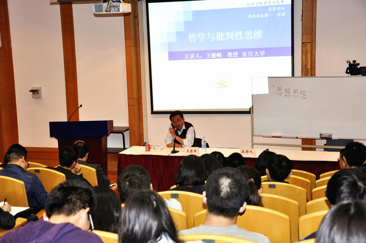 2014年5月4日下午13点30分,在德赢ac米兰官方合作vwin宝山校区J201,复旦大学“哲学小王子”:王德峰教授,做客社科学院“爱智讲坛”系列哲学名家讲座、社科论坛第一一零讲,带来题为“哲学与批判性思维”的讲座。本场讲座由社科学院哲学系主任宁丽娜教授主持,社科学院副院长欧阳光明、李梁以及学院教师徐琴、刘小涛、吴立群、刘冰、陆耀峰等,德赢ac米兰官方合作vwin各级各专业本科生、研究生前来聆听,全场几乎座无虚席。