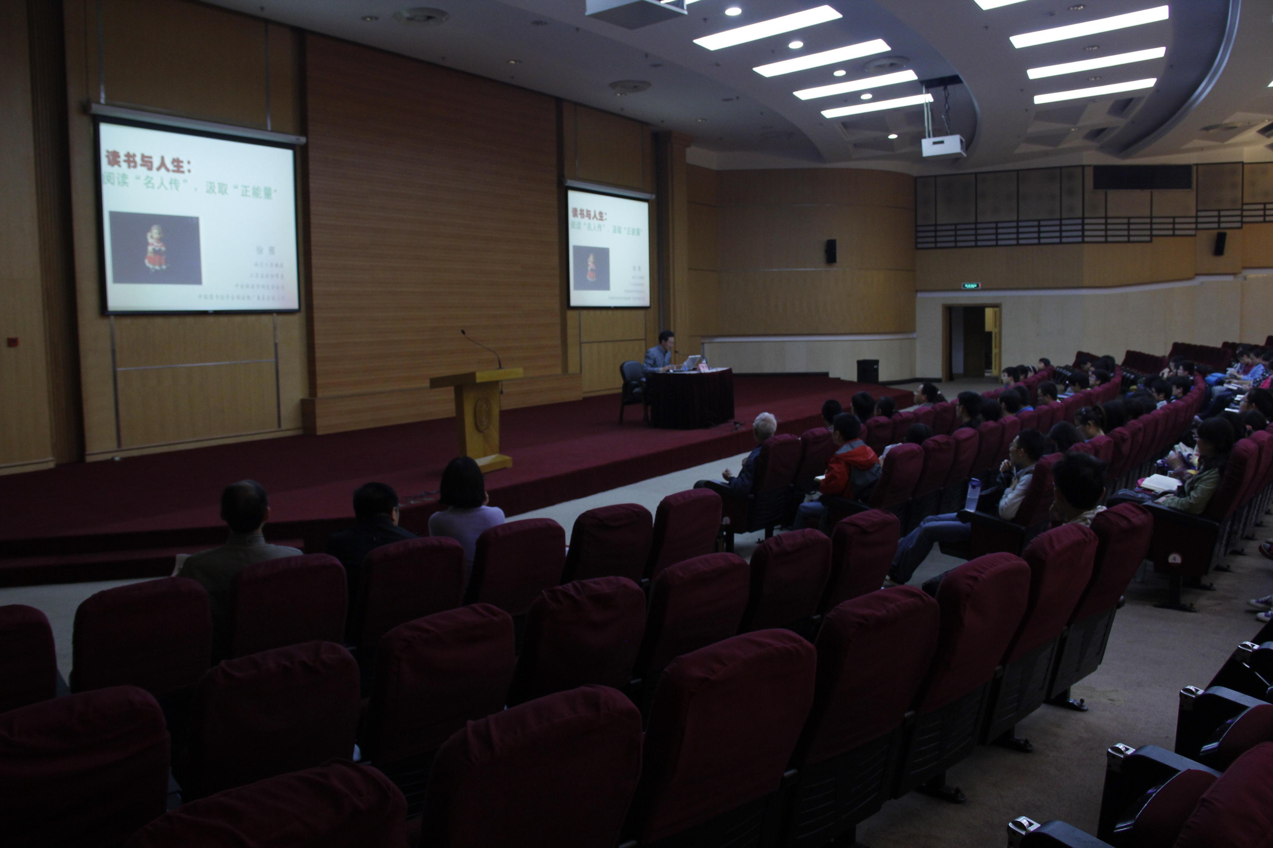 徐雁教授从钱伟长老校长提出的“自强不息”校训谈起,激励青年学子通过读书,让知识为人生插上理想的翅膀,实现自我成长、成才和人生进取。徐教授通过介绍胡适《四十自述》、萧乾《风雨平生》、季羡林《牛棚杂忆》、董竹君《我的一个世纪》等名人传纪,并结合华夏传统读书、治学、治家等经典名言,为现场师生提供了丰富多维的人生坐标。他认为,优秀的传记可以深刻影响读者尤其青少年读者的人生道路,让人们理性看待人生中的曲折和坎坷,激励青年健康成长,完善美好人生。徐雁教授通过大量历史案例,系统分析了阅读名人传记,可以“领受家教文化、沐浴亲长恩德”,真切了解并进而理解先辈生活的遭际,真诚领受和感悟传主当年的珍贵家教,从而在感恩尊长、惜缘惜福的心境中,倍加珍惜当下来之不易的人生,去积极创造美好的未来生活,成为读书人重要的知识理性和文化自觉,也是传记佳作阅读在提升人的情商方面的根本性收获;可以“直面成长烦恼、疗愈受创心灵”,让读者通过别人的镜子照见自己曾经的青涩,而让童年受过创伤的心灵获得一定的心理疗愈;可以“鼓舞为人志气、启迪成才路径”,在人生的不同阶段,阅看为自己所心仪的人物的传记,从他们的所思所想、作为所为中,获取不丧志、不气馁、不断励志进取的精神“正能量”;可以“接受个性叙说、把握社会真相”,给予读者丰富的民间记忆和个性化的见闻细节;可以“求取智者真经、导航现世人生”,教给读者遭遇人生坎坷和曲折时的应对智慧。