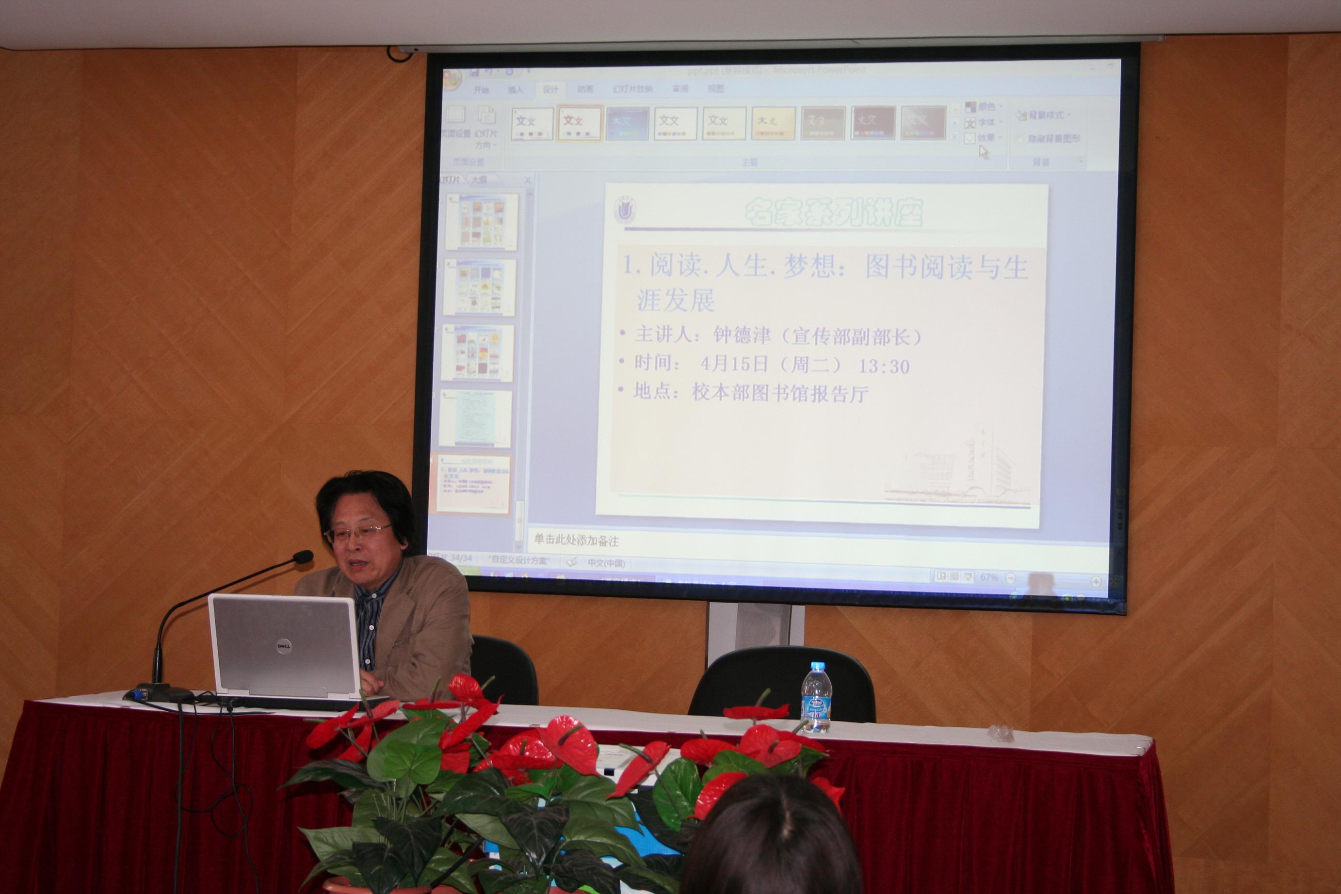 2014年4月15日下午,主题为“阅读、人生、梦想:图书阅读与生涯发展”专题讲座在校本部图书馆二楼报告厅隆重开幕,德赢ac米兰官方合作vwin宣传部副部长钟德津老师担任本次讲座主讲。