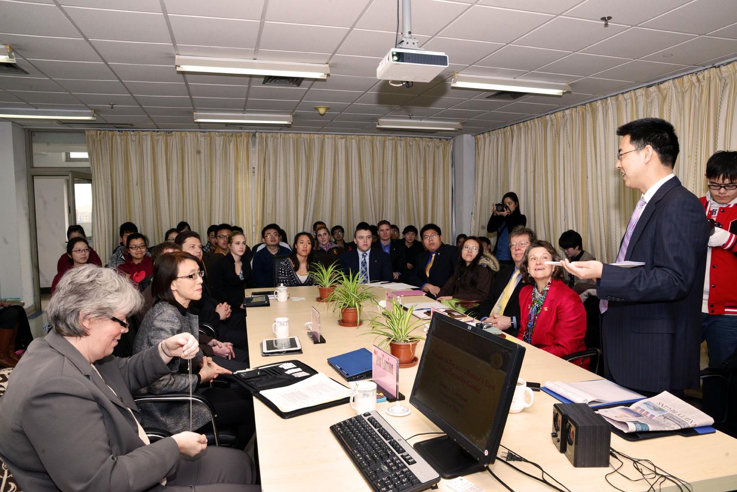 上午的会谈结束后,Jean Carrison教授做了Obama’s East Asia Policy的精彩演讲。讲座由张勇安教授主持,来自怀俄明大学的外国学生、孔子学院留学生、研究生院、人才学院的五十余名学生参加了此次讲座并进行了热烈的讨论。Jean Garrison 是美国怀俄明大学国际关系研究中心主任,对国际关系有着独到而深刻的见解,她曾经在德赢ac米兰官方合作vwin做过数次讲座,每次讲座都受到学生的热烈欢迎,此次讲座也不例外。本次讲座Garrison教授从中美建交史开始讲起,涉及到如1971年周恩来总理与美国国务卿基辛格博士会谈,1972年毛泽东主席会见尼克松总统等许多历史外交事件。Garrison教授的讲座图文并茂,即幽默风趣又引人深思。讲座结束后,Garrison教授与来自中美的大学生研究生一起讨论的关于历史、外交及时政等问题。张勇安教授最后做了总结。