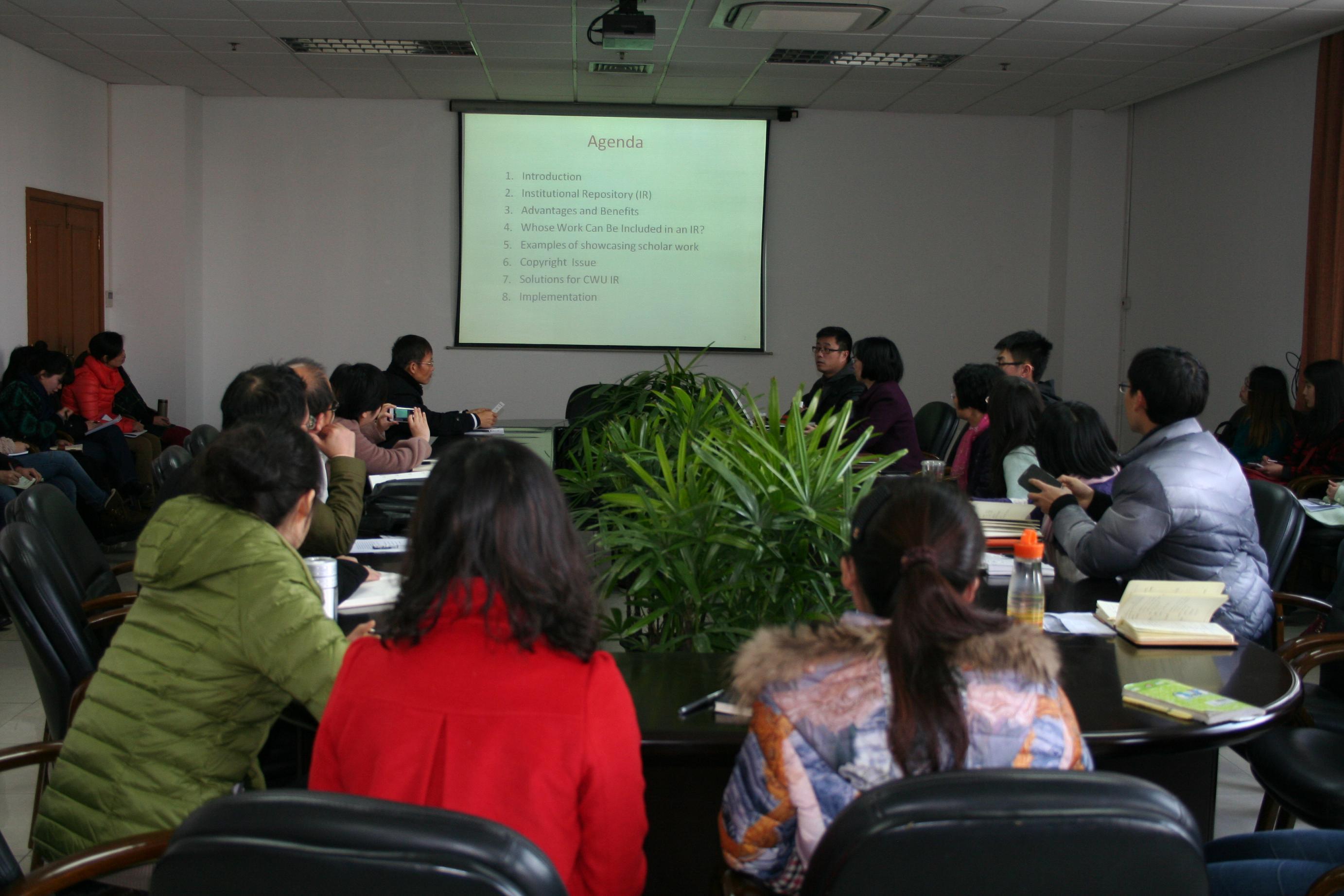 2014年3月14日上午,应德赢ac米兰官方合作vwin图书馆邀请,美国中央华盛顿大学(Central Washington University)图书馆系统部总负责人傅平先生前来校图书馆作《机构库服务与发展》学术报公告会,图书馆副馆长刘华主持报告会,馆办公室、资源建设中心、读者服务中心、信息服务中心等部门同仁近40人参加报告会交流,上海地区部分高校图书馆同仁也前来参加交流。