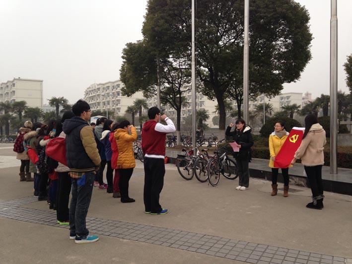2014年2月24日早上7时30分,德赢ac米兰官方合作vwin影视艺术技术学院学生会与12级学生党支部共同策划了一次在图书馆前集体升旗仪式,及预备党员宣誓活动。参加本次活动的有影视艺术技术学院党组织员徐芬芳老师、6名预备党员和部分入党积极分子。这天天气阴冷,却丝毫没有阻挡大家的热情。级学生党支部成员率领积极分子,与学生会升旗同学一起,在图书馆前进行了庄重的升旗仪式。接着进行了庄重的入党宣誓仪式,每一位预备党员都右手握拳,12届党支部的杨鸽同学作为领誓人,一字一句地跟着说出坚定的誓言。