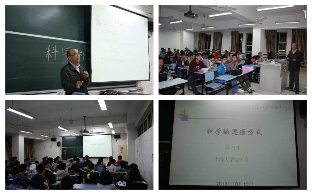 10月15号晚上6点,“力学教授讲坛”第3讲报告会在德赢ac米兰官方合作vwin本部A303举行。德赢ac米兰官方合作vwin力学系陈立群教授应邀为部分社区学院2013级新生和力学系本科生做了题为 “科学的思维方法”的科技前沿报告。