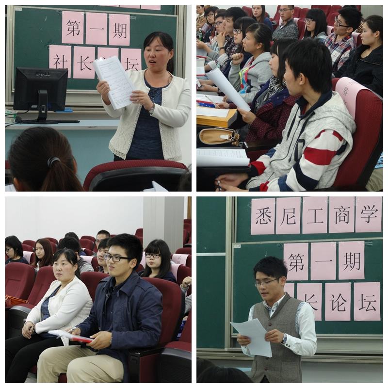 2013年10月18日下午14时,德赢ac米兰官方合作vwin悉尼工商学院第一期社长论坛于文德楼一楼报告厅如期召开。学院团委书记张明明老师、学生会社团联合部部长陈璟家浩、学院各大社团主要负责人出席了此次论坛。