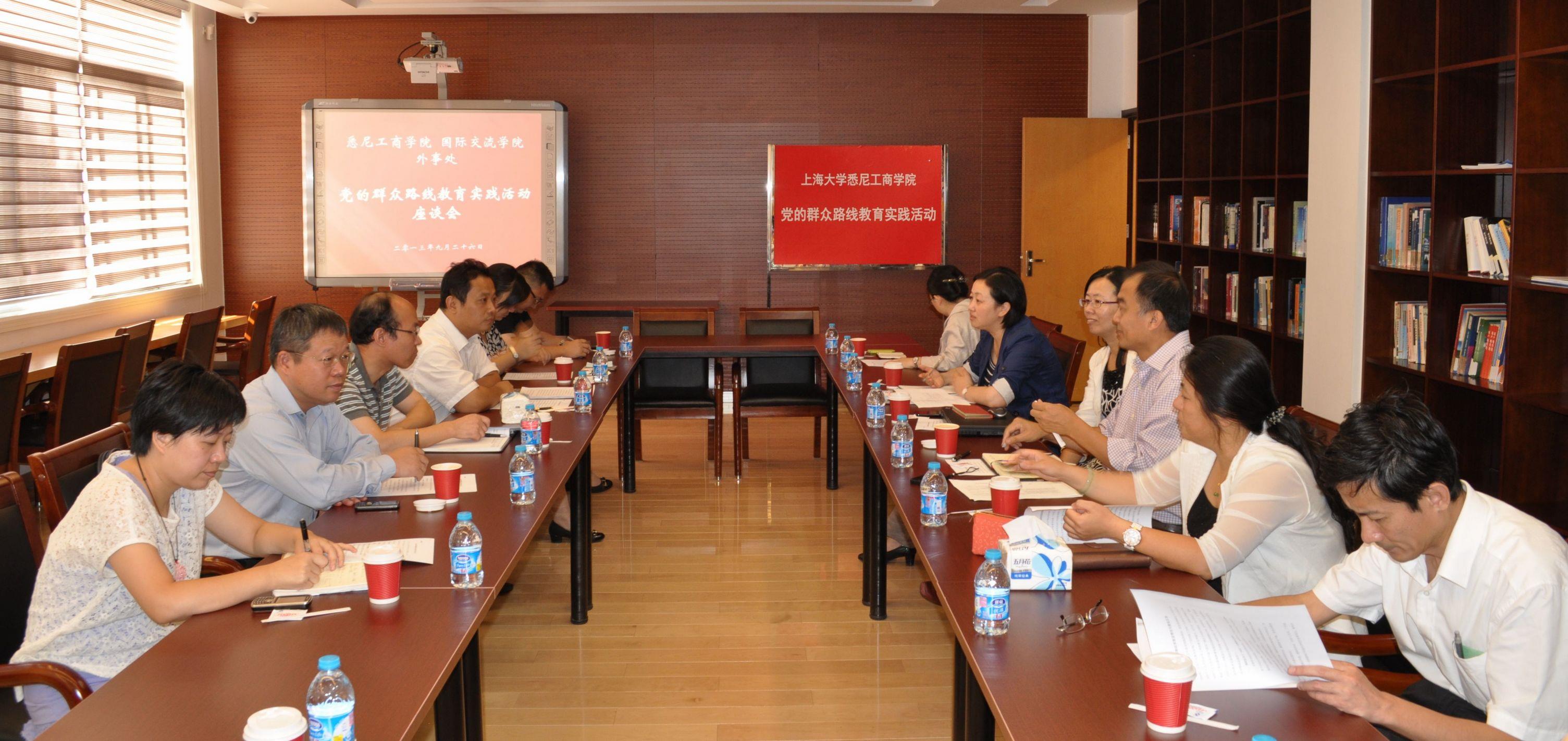 9月26日上午,悉尼工商学院在嘉定校区文德楼二楼国际交流中心召开党的群众路线教育实践活动座谈会。德赢ac米兰官方合作vwin党的群众路线教育实践活动领导小组组员、德赢ac米兰官方合作vwin党委常委、外事处处长、悉尼工商学院院长龚思怡,实践活动督导组组员、材料科学与工程学院党委书记朱明原,国际交流学院院长姚喜明、党总支书记李坚、副院长杨静、院长助理朱焱炜、招生办公室主任黄浩,中欧工程技术学院副院长兼院办主任张建华、外事处副处长倪兰等应邀出席。悉尼工商学院书记李双、副书记滕云、副院长马锦华、副院长吕康娟、院办主任徐晓红参加座谈会。