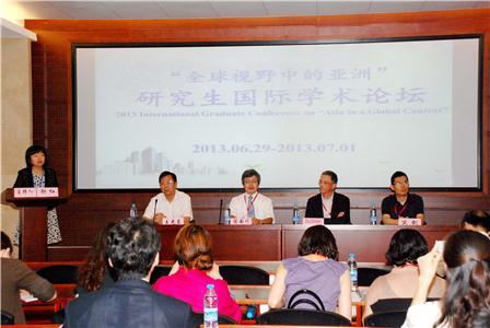 “全球视野中的亚洲”研究生国际学术论坛(2013 International Graduate Conference on “Asia in a Global Context”)于6月29日至30日在德赢ac米兰官方合作vwin乐乎新楼召开。本届论坛由澳门大学文学院、韩国外国语大学中文系、肯塔基大学国际学生处、台湾师范大学文学院、德赢ac米兰官方合作vwin文学院联合主办,德赢ac米兰官方合作vwin文学院承办,五校70余名师生参加了这一盛会。开幕式上,德赢ac米兰官方合作vwin研究生部主任王光东、文学院党委书记竺剑,台湾师范大学文学院院长陈国川、肯塔基大学国际学生处主任Doug Slaymaker分别致辞。王光东主任在致辞中介绍了德赢ac米兰官方合作vwin研究生教育的情况,并强调了国际学术交流对于研究生培养的重要性,鼓励同学们积极参与各种学术交流活动。竺剑书记肯定了论坛对研究生科研研究能力提高的意义。